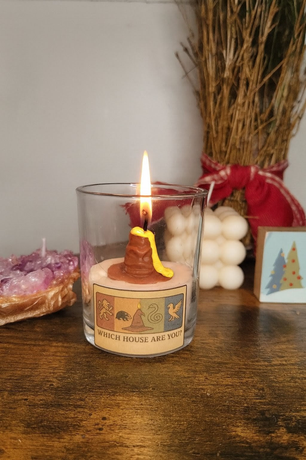 Each candle is carefully hand-poured, and at its center sits a miniature sorting hat–shaped topper. As the wax melts, a hidden colored reveal will appear inside — showing your magical house.